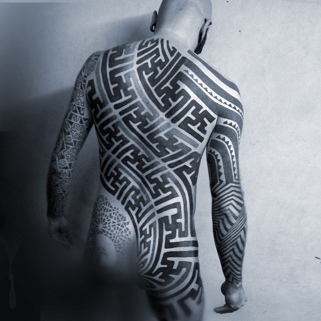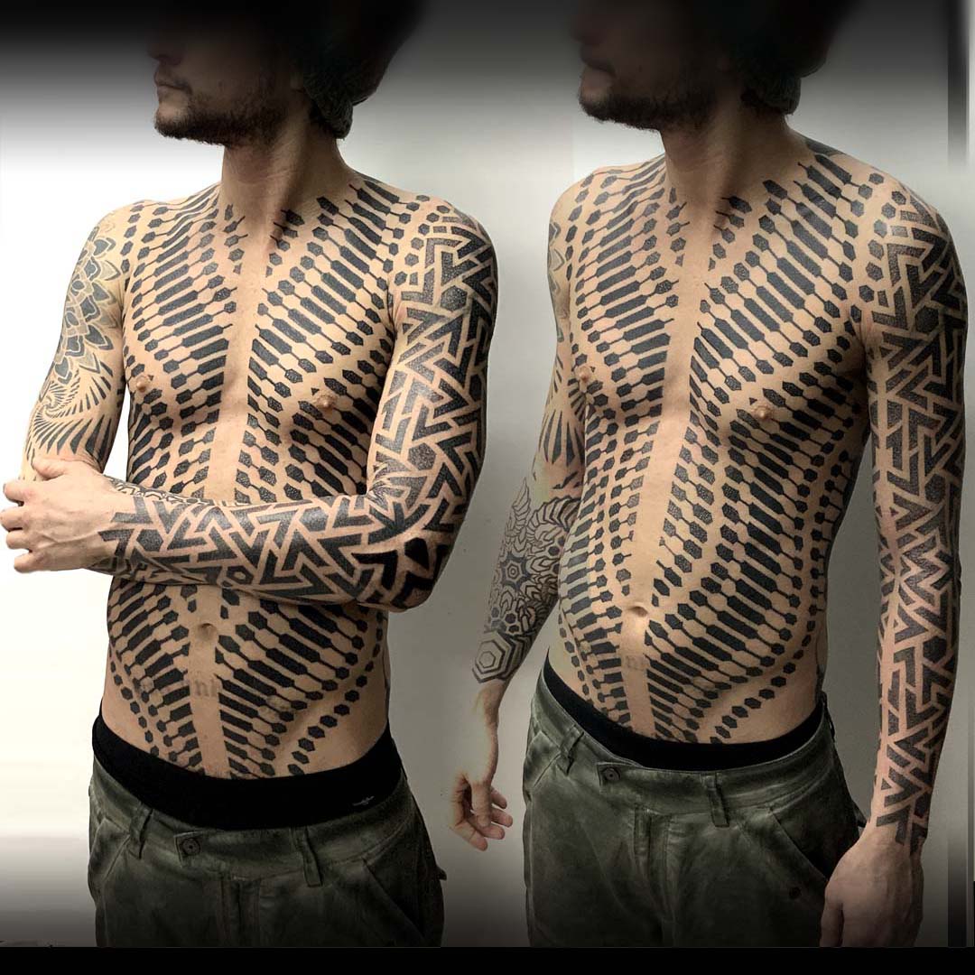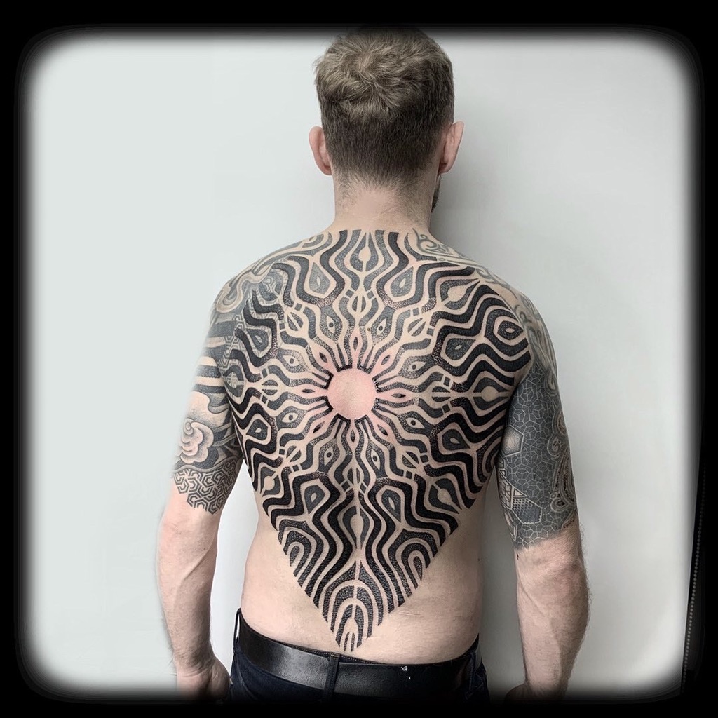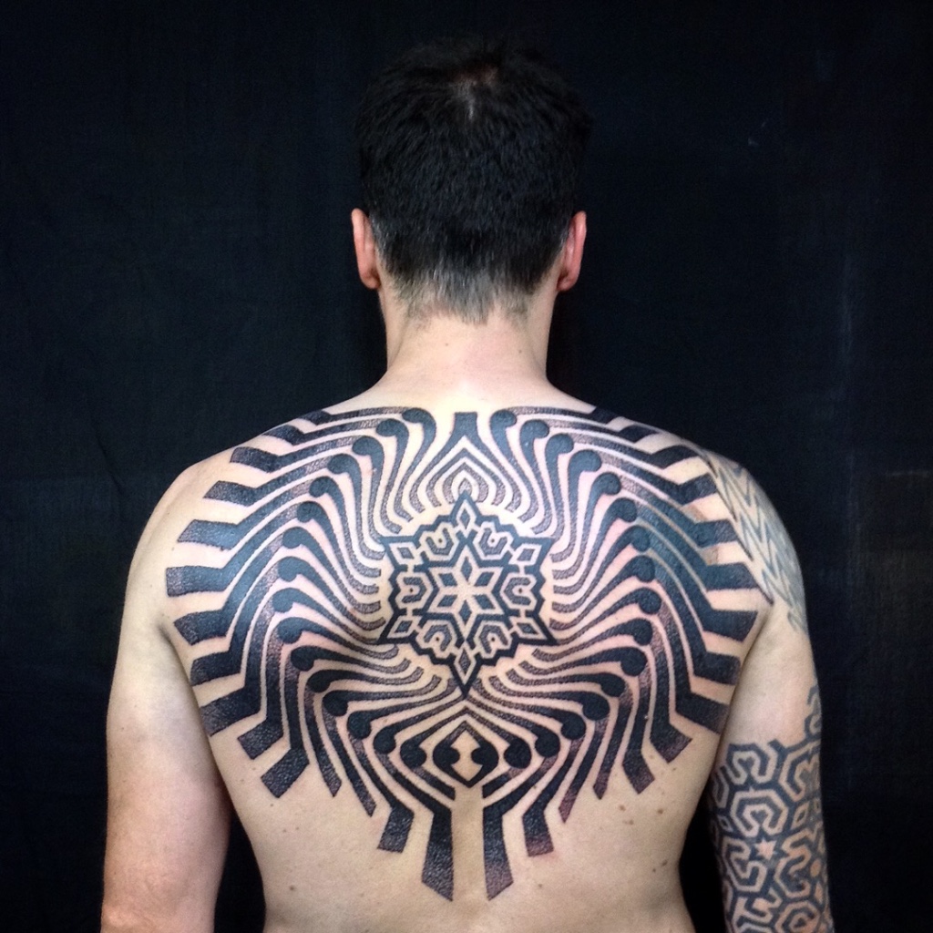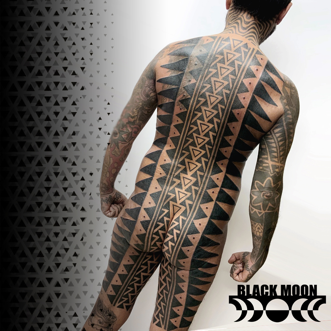 Tomas Tomas 108 started tattooing in the mid-nineties in Manchester UK. After a traditional apprenticeship, he moved to London in 1999 to work at Bug’s “Evil From the Needle” for a few years. He then joined Alex Binnie’s team at the “IN2U tattoo” shop. He worked there for over 15 years. While studying traditional tribal tattoos, he developed a more modern style involving dotwok and complex geometric designs. He is today considered a pioneer in this style which is now very popular worldwide. Now in Kumagaya Japan at BLACK MOON TATTOO, he enjoys doing large scale work, but also smaller “one point” tattoos .